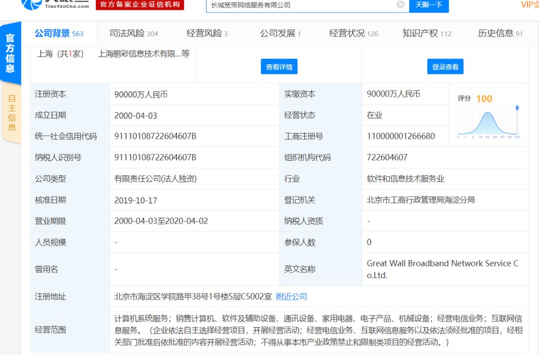 (天眼查搜索“长城宽带”结果显示)